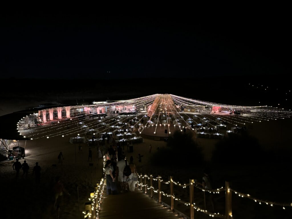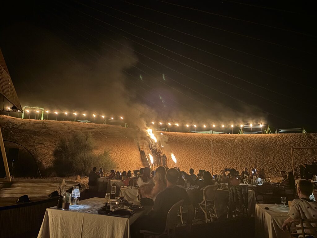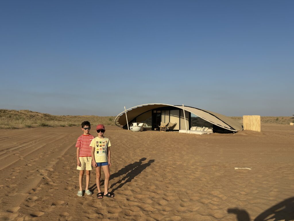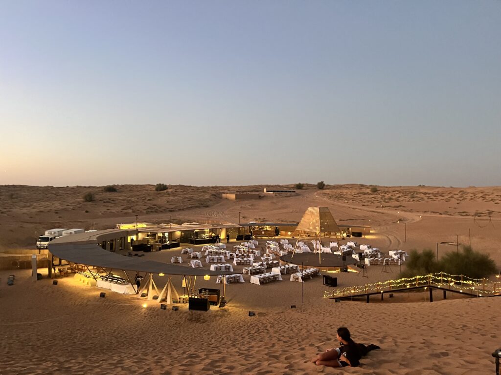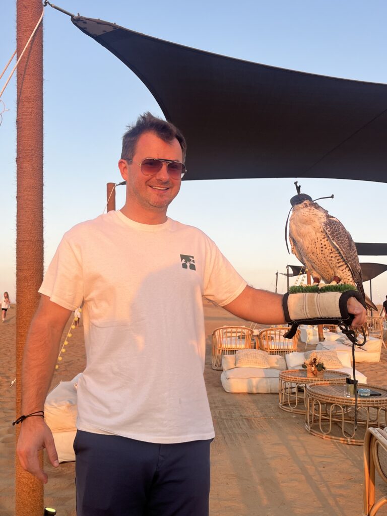 Ostatnia noc śpimy w takim luksusowym „obozie” Sonara na pustyni. Kolacja na pustyni w oazie niedaleko Dubaju, drinki, zachód słońca, wielbłądy, orły – wszystko co Emiraty mają najlepsze.