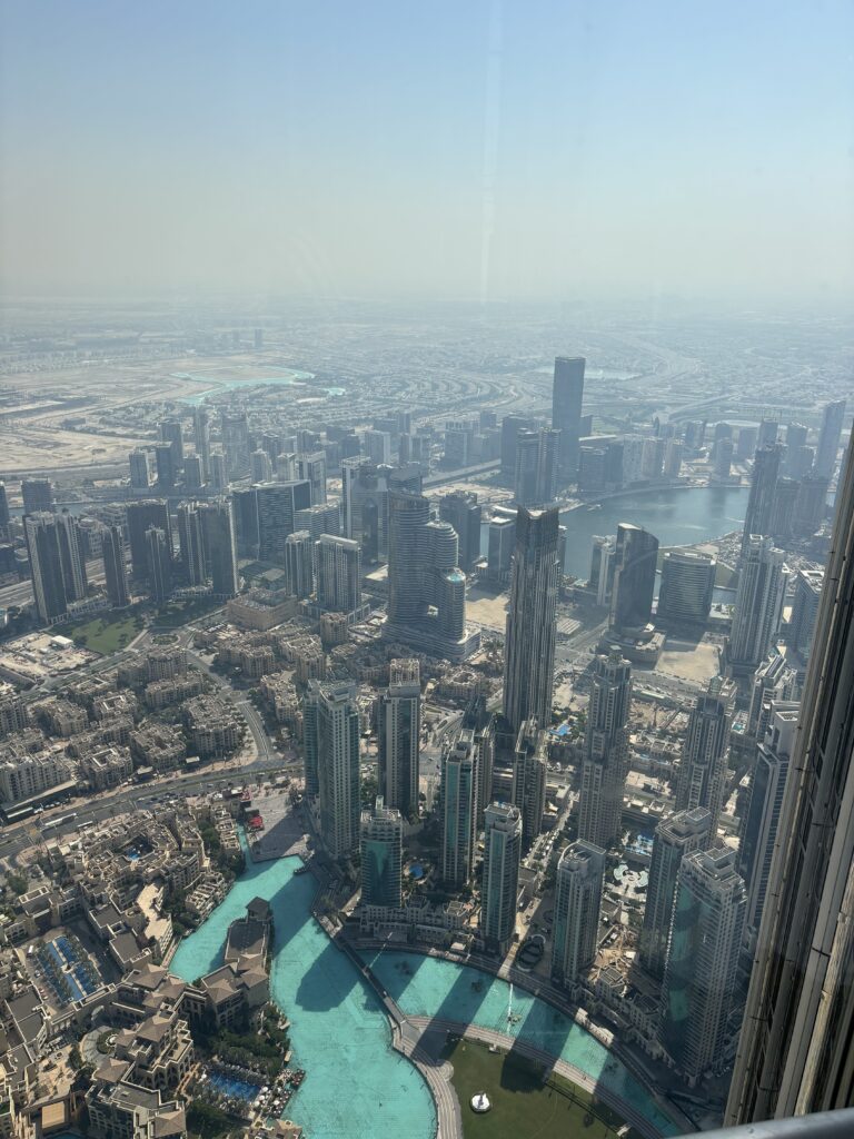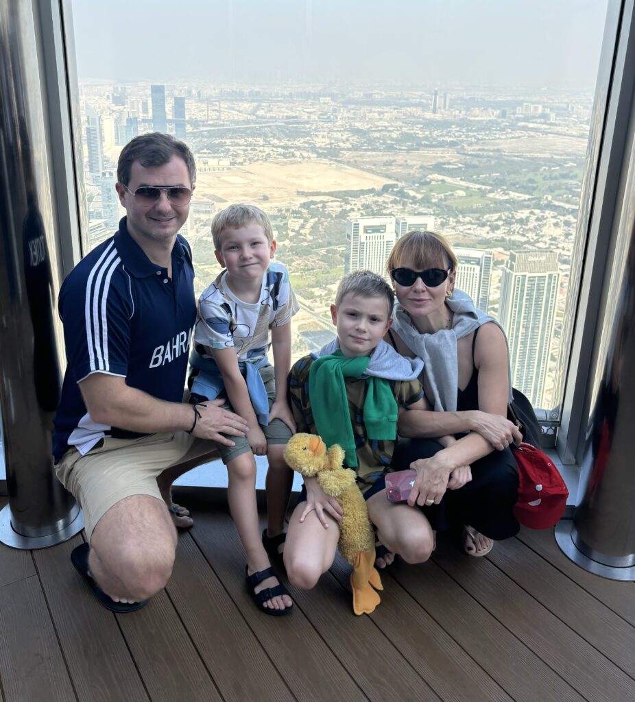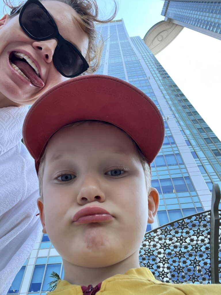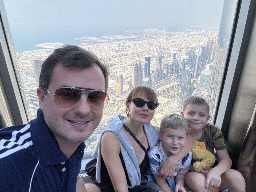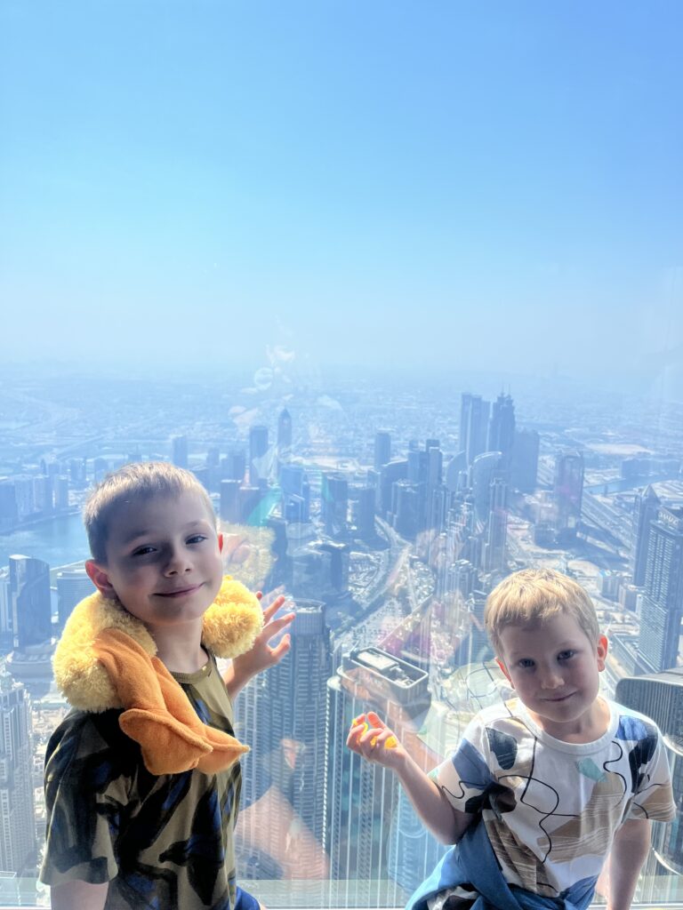 Wylot będziemy mieć z Dubaju, więc ostatnie 2 dni spędzamy w tym mieście, gdzie spotykamy się ze znajomymi i po prawie 15tu latach ponownie (tym razem z dziećmi) wjeżdżamy na Burj Khalifa, czyli najwyższy budynek świata. Poprzedni wjazd byl z rodzicami Tomka 🙂 Widok jak zawsze mega, ale dopiero ze 125 pietra widać skalę rozwoju w Dubaju. Mimo że jesteśmy tu dość często, to za każdym razem odkrywamy coś nowego. Olaf na budynek od lat mówi Rakieta, a Gucio.. Burżek.