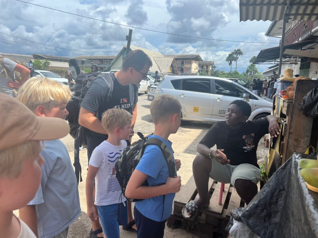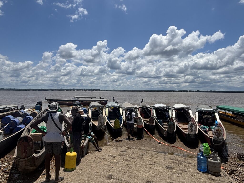 W Albinie nasz kierowca Sameer wysadza nas nad ogromną rzeką graniczną. I tu zaczyna się show: z miejsca otacza nas grupa lokalnych „przewoźników”, każdy chętny, żeby nas zabrać na drugi brzeg. Krótkie negocjacje, ustalamy cenę – i już siedzimy w małej łupince, która podskakując na falach, przenosi nas do Gujany Francuskiej. Po kilku minutach jesteśmy „we Francji”… a roaming działa jak w domu! Internet wrócił, dzieciaki zachwycone.