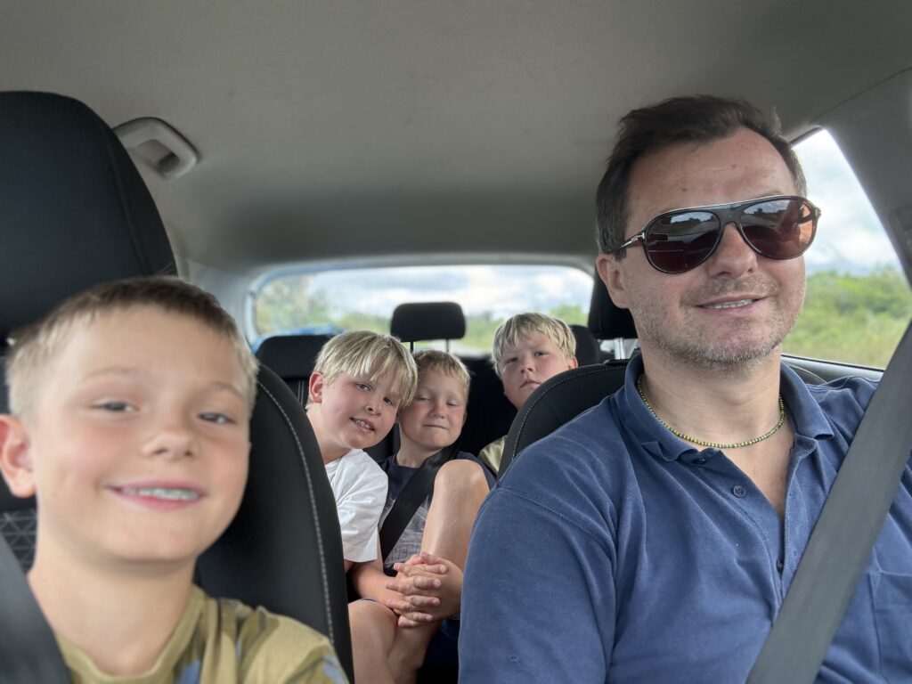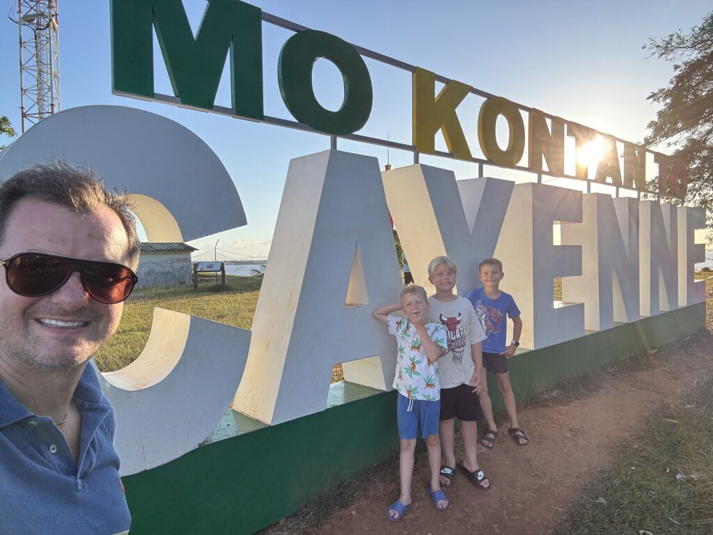 W międzyczasie udaje nam się (po sporym wysiłku!) wynająć dwa samochody i ruszamy na krótką wycieczkę do Cayenne – stolicy Gujany Francuskiej, oddalonej o godzinę drogi od Kourou. Nazwa „Cayenne” wyjątkowo wpada w ucho chłopcom – zwłaszcza że podczas jazdy gramy w zgadywanie stolic. Sama stolica… nie powala. Ale nadrabia piękną, szeroką, piaszczystą plażą, na której naprawdę można złapać klimat Karaibów. 🌴