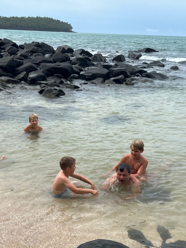 Na koniec wskakujemy do oceanu podczas przypływu. Chłopcy są wniebowzięci, a my – szczerze mówiąc – też. Cała wycieczka trwa ponad 6 godzin i jednogłośnie uznajemy, że rejs z Bruce’em był o niebo lepszy niż te wielkie, komercyjne katamarany. Szybciej, bliżej, bardziej autentycznie.