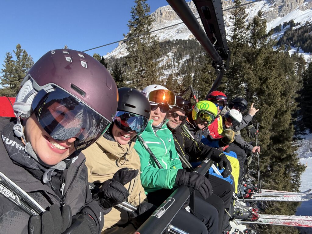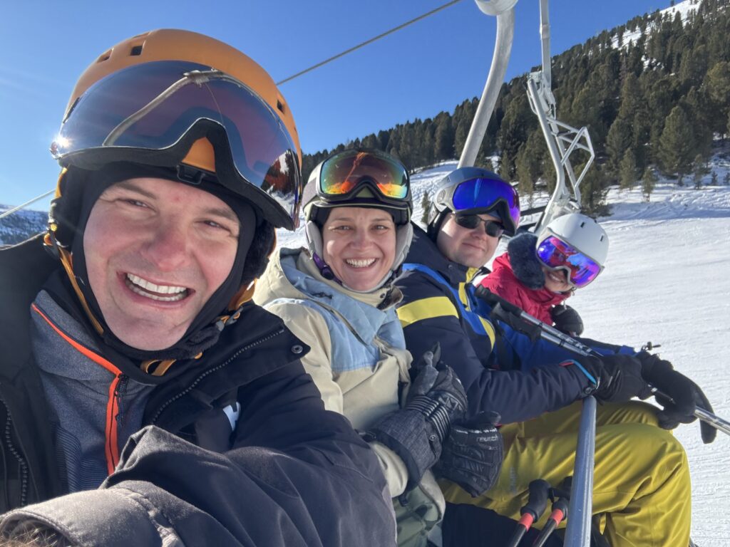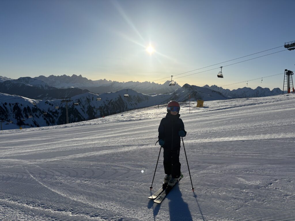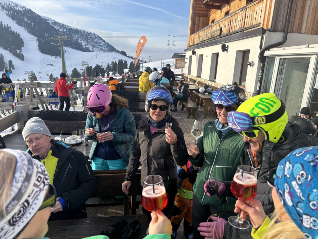 Program sportowy zakłada jak zawsze codzienne narty od 10 do 16.00, śmigamy na połączonych ze sobą 3 ośrodkach narciarskich: Pampeago, Cavaleze i Predazzo. Dzieci i Agata sa zapisani na trening narciarski, każdy w swojej grupie wiekowej. Pogoda przez 6 dni z rzędu jest idealna- bezchmurne, niebieskie niebo i przyjemne temperatury – nawet do 10 stopni w ciągu dnia. Agata ma świetną ekipę, która oprócz intensywnego treningu na stokach, regularnie odbywa degustację lokalnych włoskich napojów % tj bombardino, calimerp, grappa, prunia, i inne. Tomek szaleje na nartach z kim może, bijąc z Grzesiem rekordy prędkości (w tym roku 109km/h na czarnej trasie, prawie 60km przejechane w 1 dzień etc). Tomek to generalnie zawsze szukał kto w danym momencie jeździ i się podłączał i porywał na czarne trasy (Ania je już teraz uwielbia bo w końcu można się rozpędzić 🙂 z ciekawostek: Agata z grupą zabierają na stok szlafroki i w nich zjeżdżają 🙂 Olaf, Gucio mały, Gucio duży, Zosia i Kacper wygrywają końcowe zawody w slalomie w swoich kategoriach wiekowych 🙂 nieważne że niektórzy z nich są w tym samym wieku (Kacpra i Gucia dzielą 3 tygodnie :))