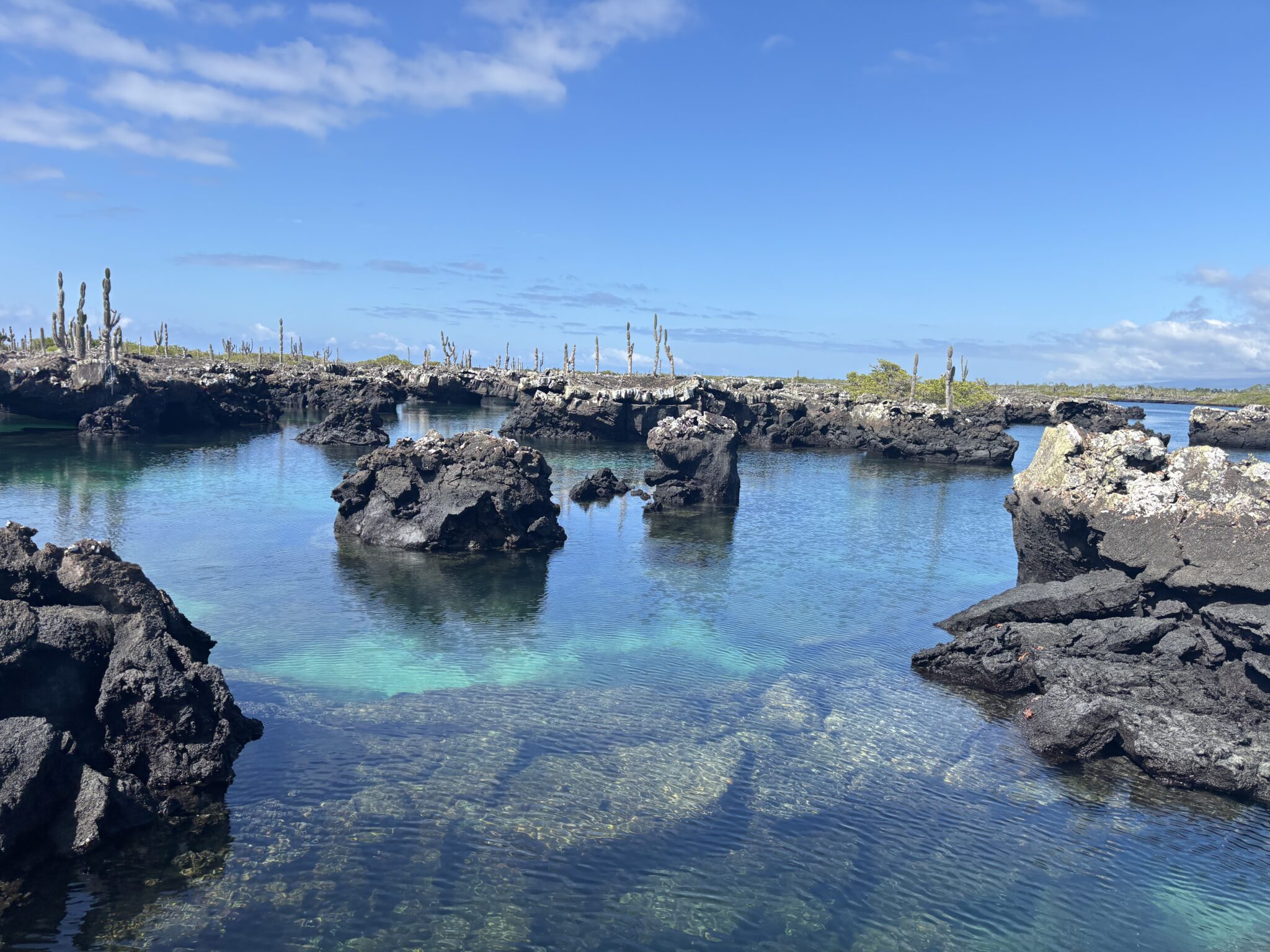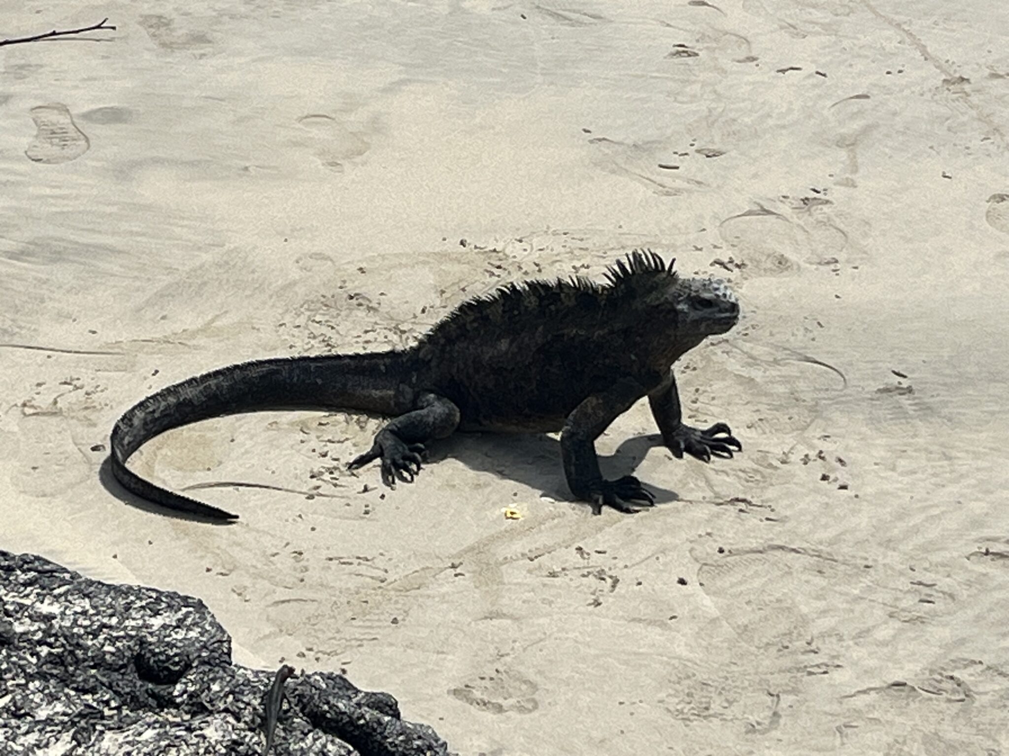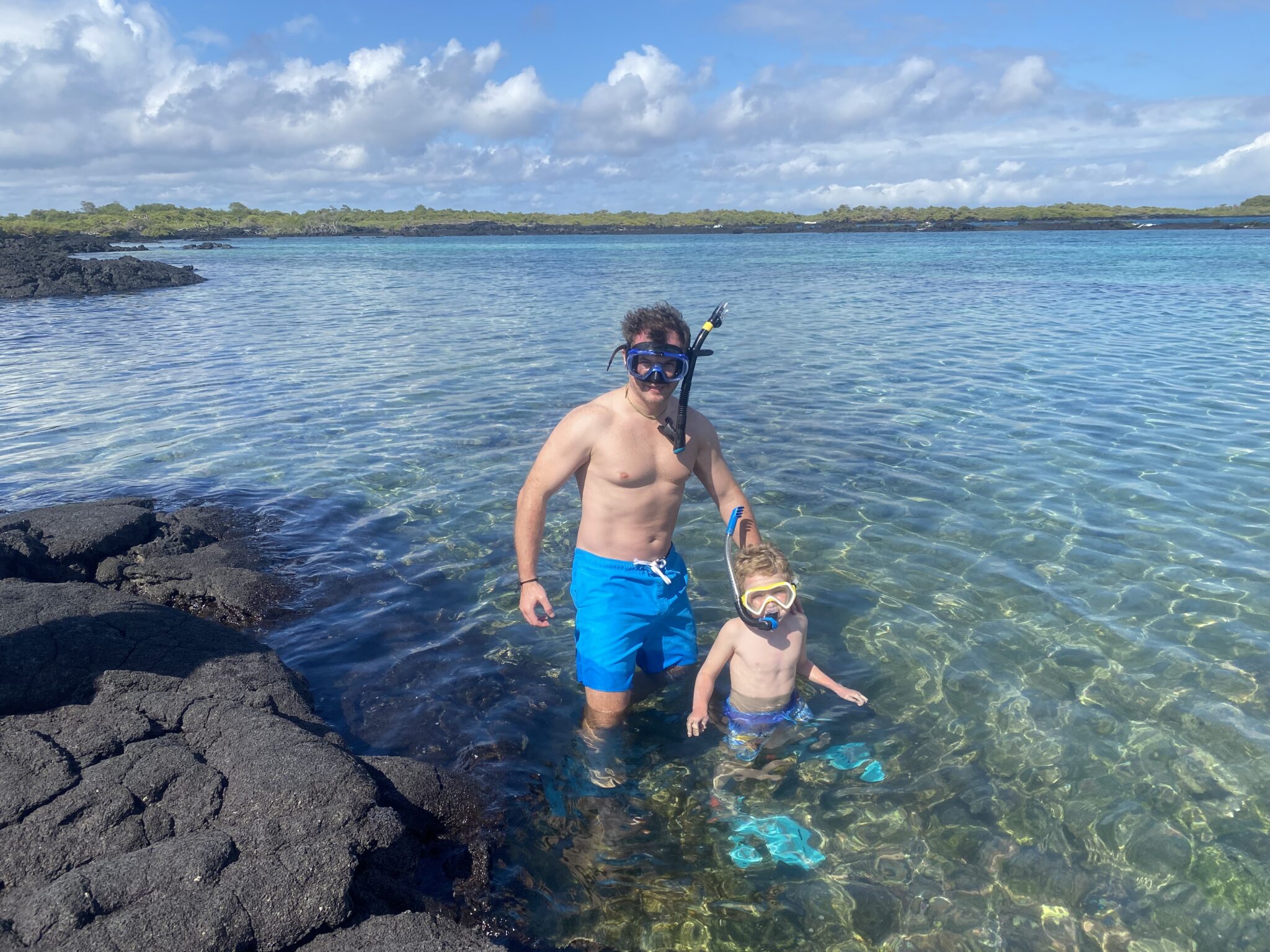 Tego dnia czeka nas popołudniu snorkelling i odwiedzenie ciekawych formacji skalnych powstałych wskutek erupcji wulkanów (zwanych los tunnelos). W wodzie podziwiamy liczne gatunki ryb i stworzeń morskich tj koniki morskie, rozgwiazdy i żółwie morskie. Spacerując po skałach oglądamy kraby (są bardzo kolorowe i niektóre z nich całkiem pokaźnych rozmiarów), widzimy małe pingwinki (dorosłe osiągają wysokość 35cm wysokości), liczne iguany, lwy morskie i niebieskonogie głuptaki (symbol wysp Galápagos). Głuptaki (ang blue leg boobies) sa gatunkiem ptaków występującym tylko na Galapagos, a swoje niebieskie nogi zawdzięczają jedzeniu sardynek, gdzie ich toksyny nadają nogom ptaków charakterystyczną niebieską barwę. Po powrocie widzimy jeszcze 2 iguany walczące o życie. Nie ma żartów! Popołudnie spędzamy leniwie w swoim pięknym domku, dzieciaki szaleją w wodzie, a my wylegujemy się na ciepłym piachu. Przyjemne zakończenie dnia:)