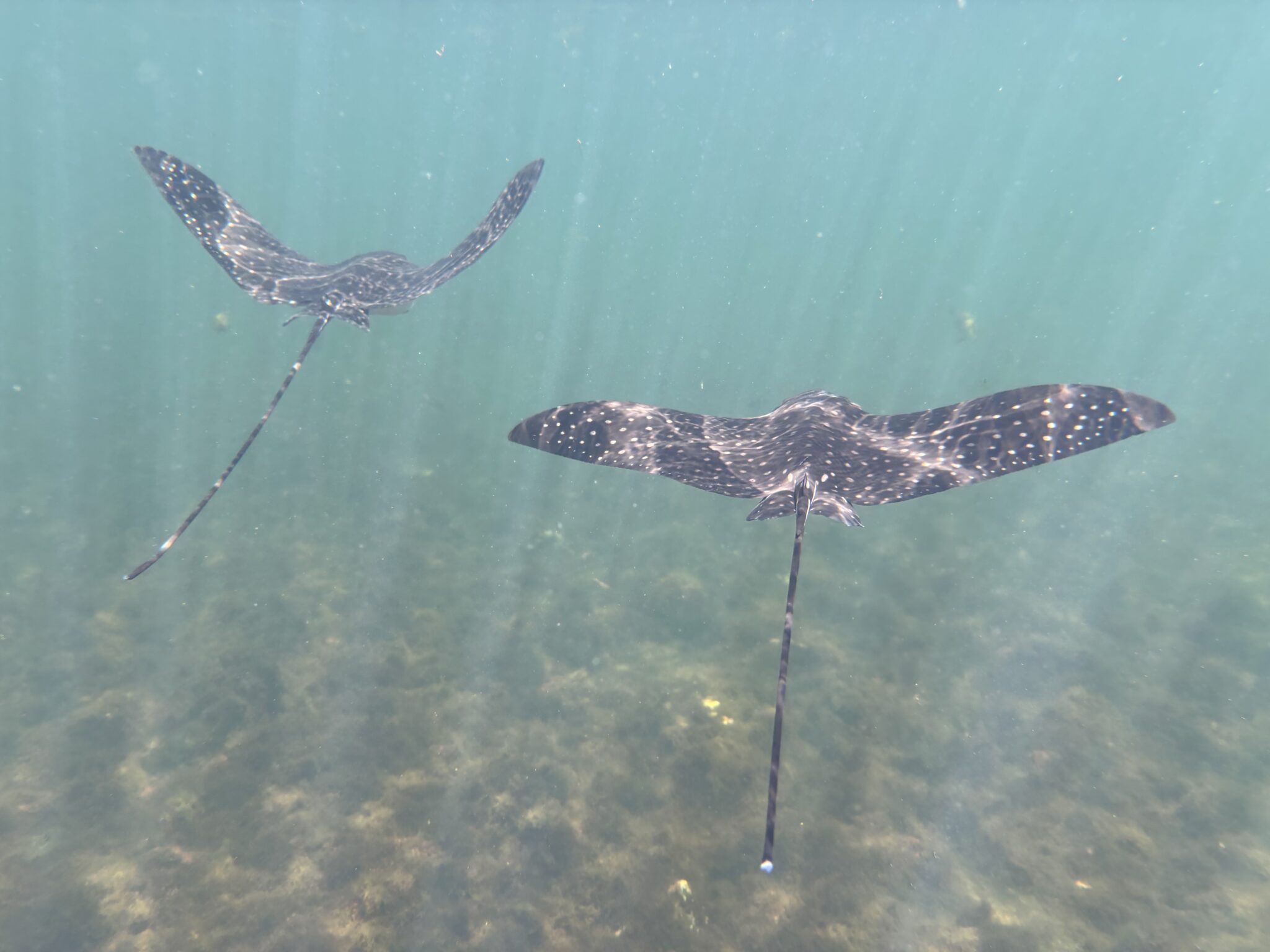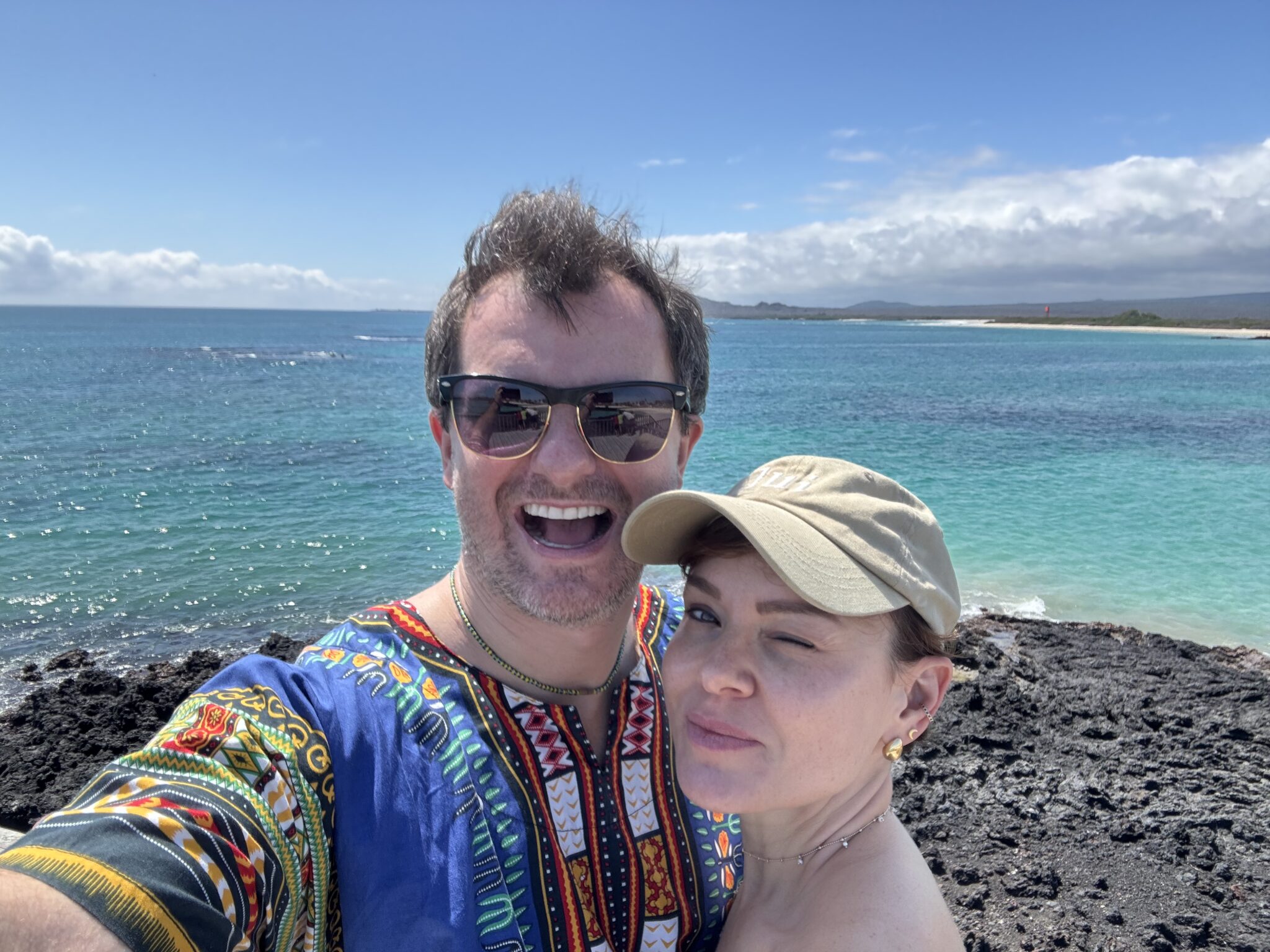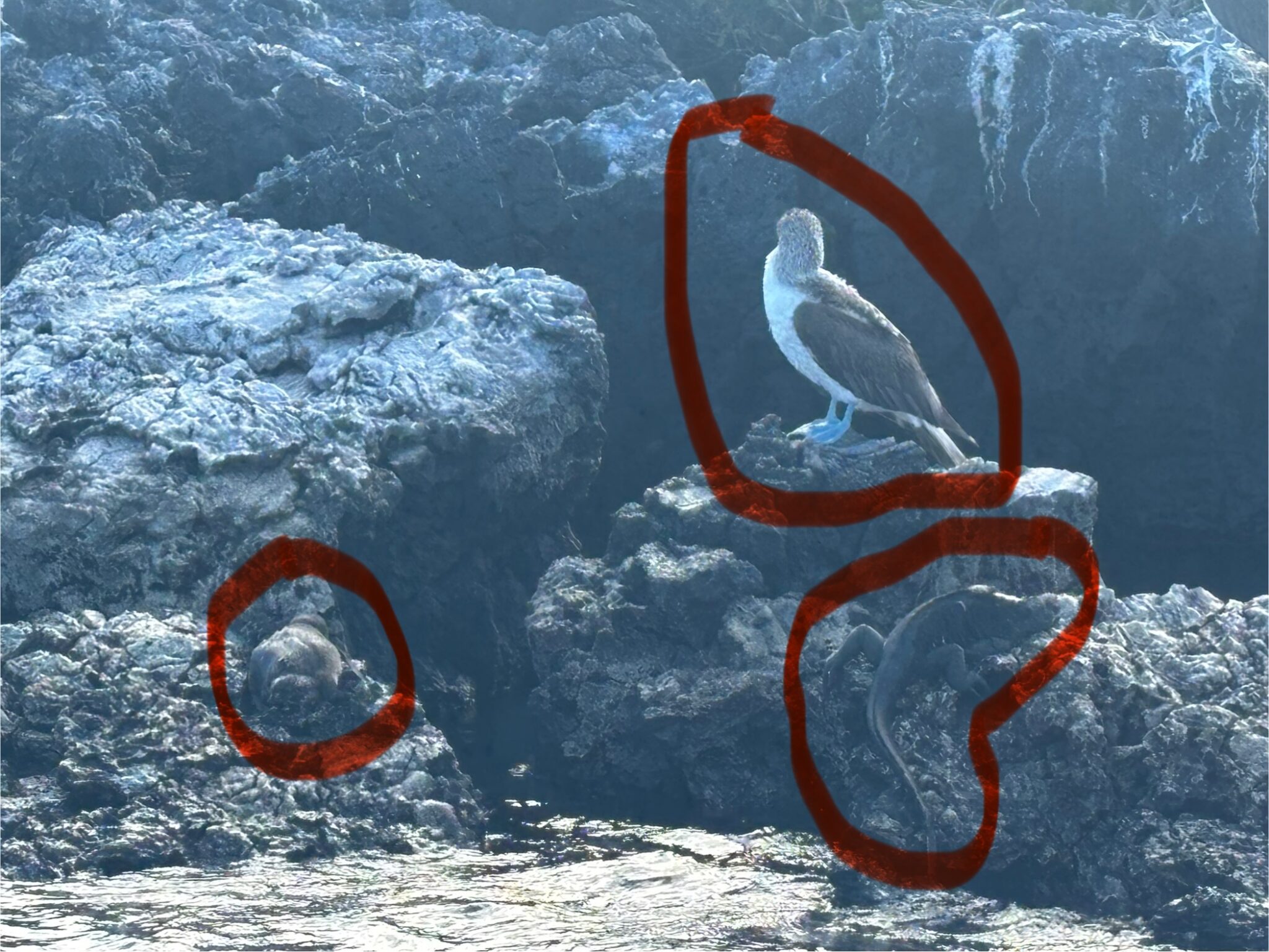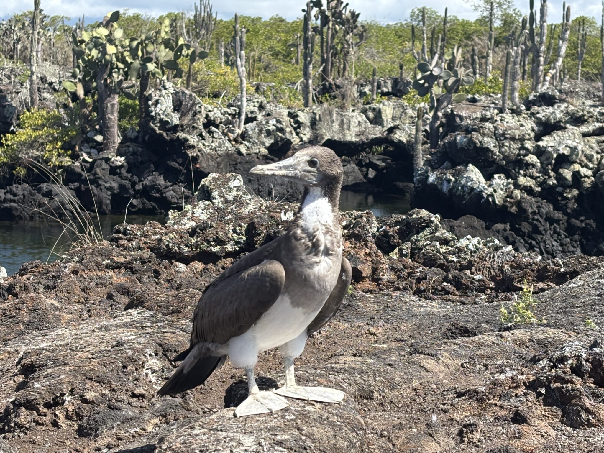 Tego dnia czeka nas popołudniu snorkelling i odwiedzenie ciekawych formacji skalnych powstałych wskutek erupcji wulkanów (zwanych los tunnelos). W wodzie podziwiamy liczne gatunki ryb i stworzeń morskich tj koniki morskie, rozgwiazdy i żółwie morskie. Spacerując po skałach oglądamy kraby (są bardzo kolorowe i niektóre z nich całkiem pokaźnych rozmiarów), widzimy małe pingwinki (dorosłe osiągają wysokość 35cm wysokości), liczne iguany, lwy morskie i niebieskonogie głuptaki (symbol wysp Galápagos). Głuptaki (ang blue leg boobies) sa gatunkiem ptaków występującym tylko na Galapagos, a swoje niebieskie nogi zawdzięczają jedzeniu sardynek, gdzie ich toksyny nadają nogom ptaków charakterystyczną niebieską barwę. Po powrocie widzimy jeszcze 2 iguany walczące o życie. Nie ma żartów! Popołudnie spędzamy leniwie w swoim pięknym domku, dzieciaki szaleją w wodzie, a my wylegujemy się na ciepłym piachu. Przyjemne zakończenie dnia:)