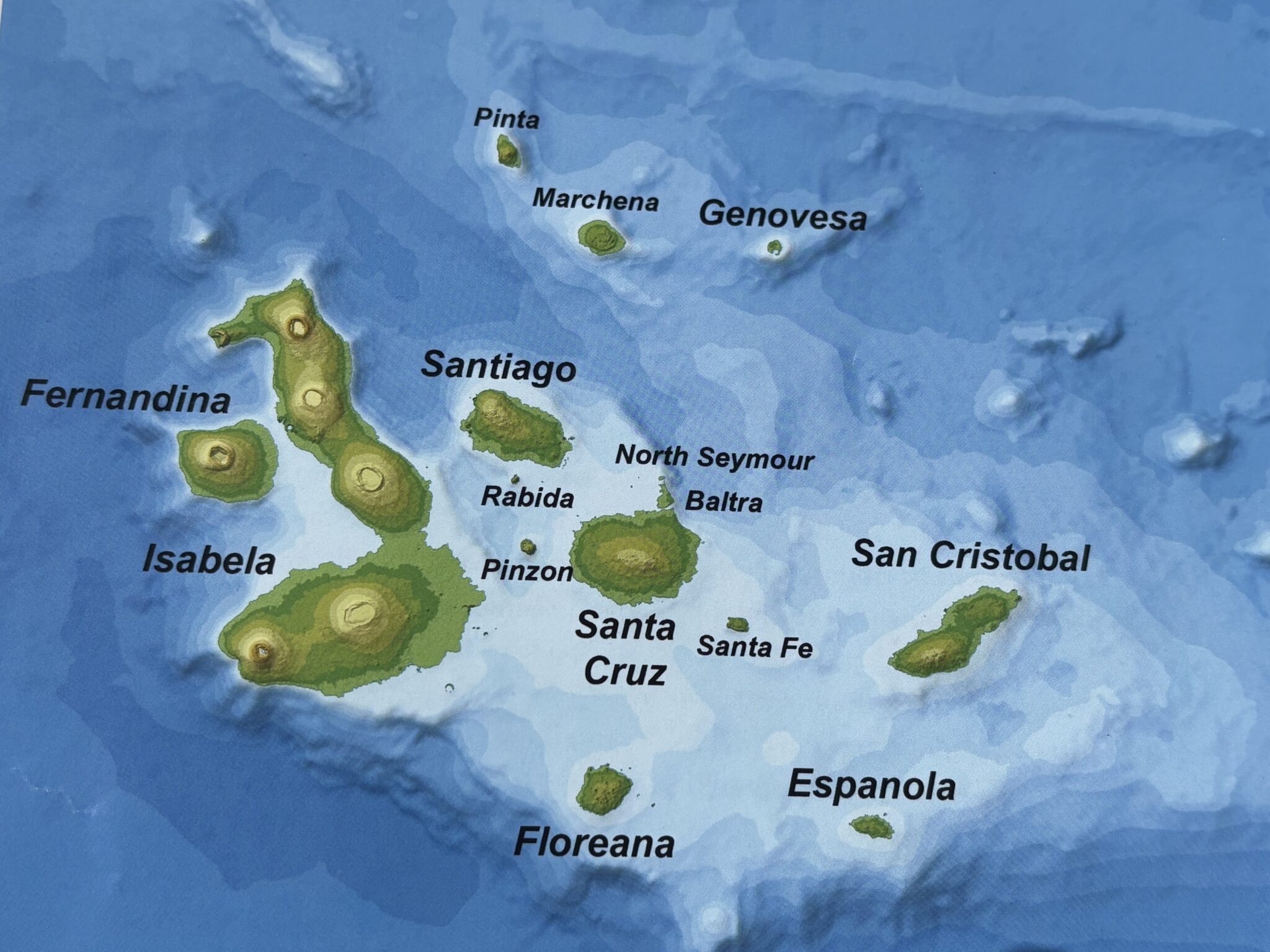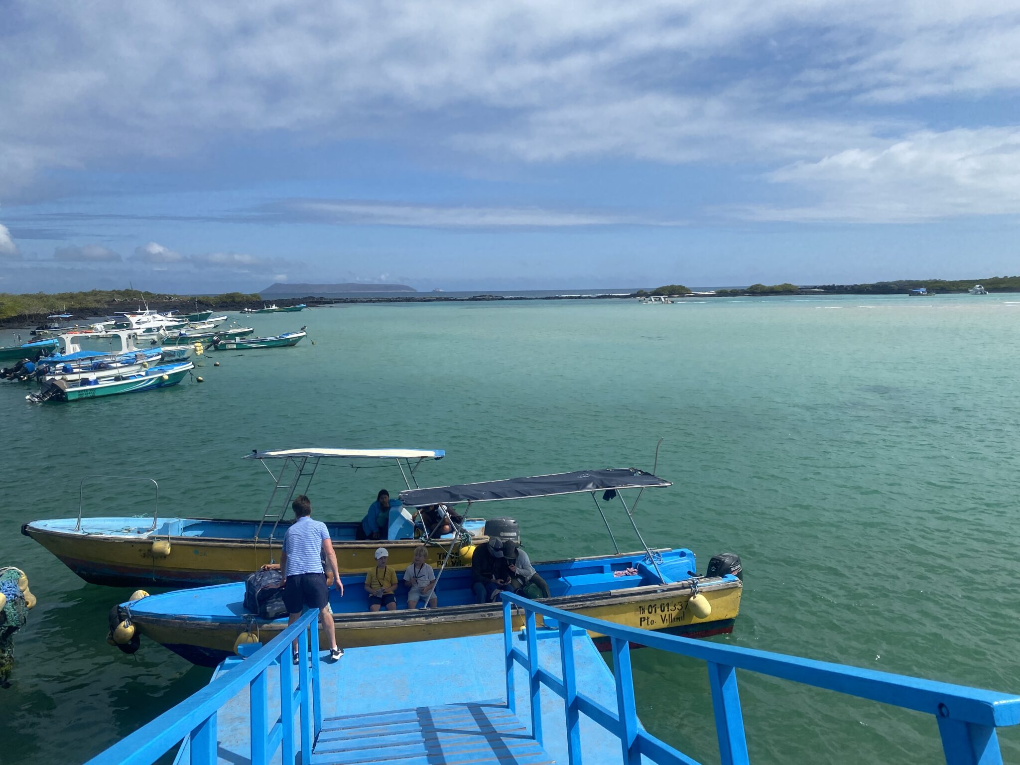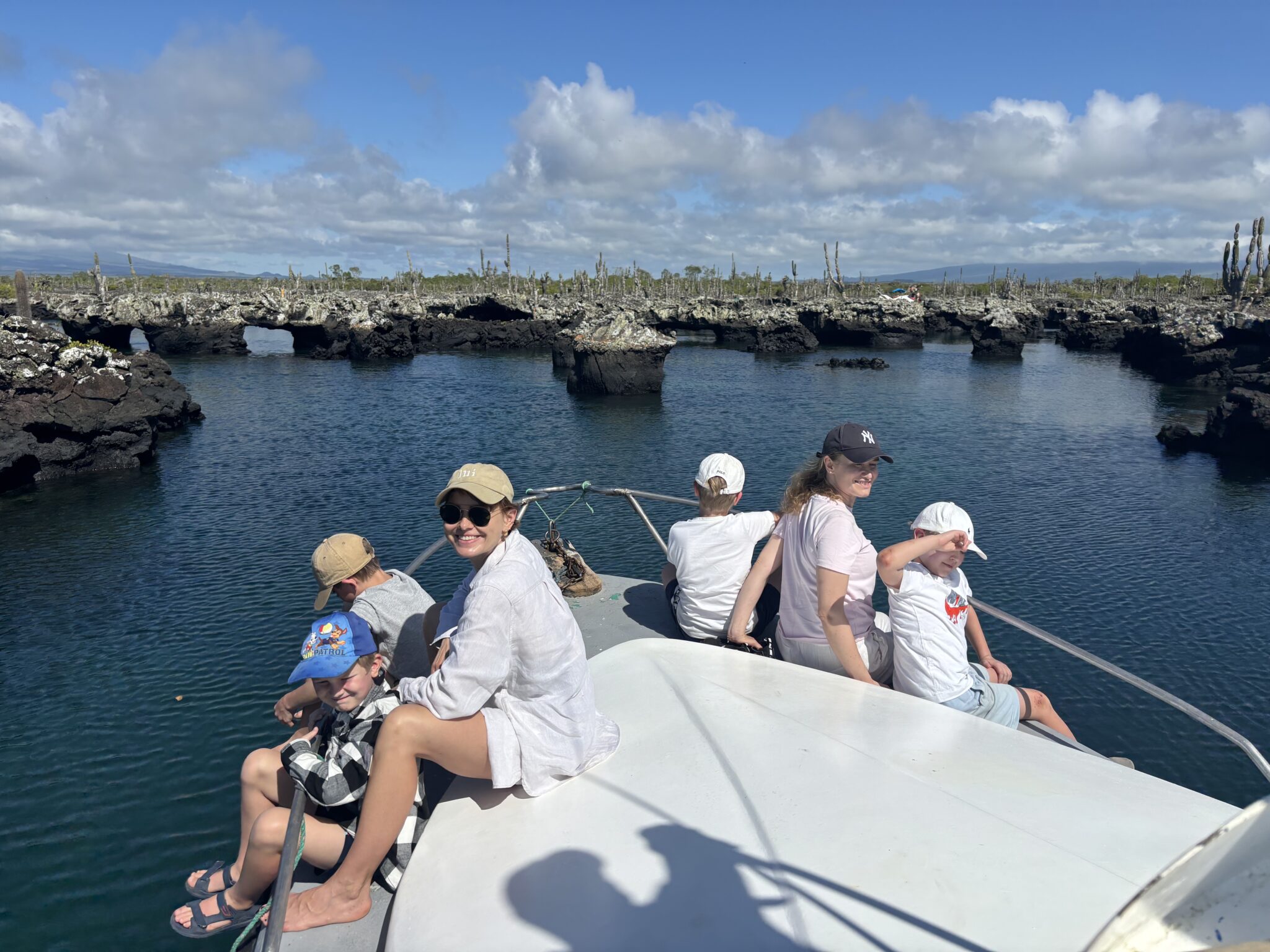 Lot z Quito do Baltry na Galápagos trwa 2 godziny, a wyspy położone są około 1000km na zachód od wybrzeża Ekwadoru. Zamieszkałe są 4 wyspy, a w sumie jest 19 wysp i kilkadziesiąt mniejszych wysepek i skałek. Jest bardzo ciepło, zdejmujemy nasze dżunglowe dresiki. Po przylocie, pierwsze zaskoczenie to iguany które mijamy już idąc z samolotu do budynku lotniska. Iguany leżą bez ruchu i obecność człowieka nie robi na nich żadnego znaczenia. Drugie zaskoczenie to że dostajemy pieczątki do paszportu, mimo że Galápagos jest przecież częścią Ekwadoru. Trzecie zaskoczenie to że za wjazd i te pieczątki na Galápagos musimy zapłacić w sumie 680 USD/ rodzinę. Gotówką. Czwarte zaskoczenie to roślinność- specyficzne karłowate roślinny (w większości endemiczne), skały i inne formacje pochodzenia wulkanicznego, które tworzą dość surowy klimat (trochę nie pasujący wyglądem do panujących tu wysokich temperatur).
