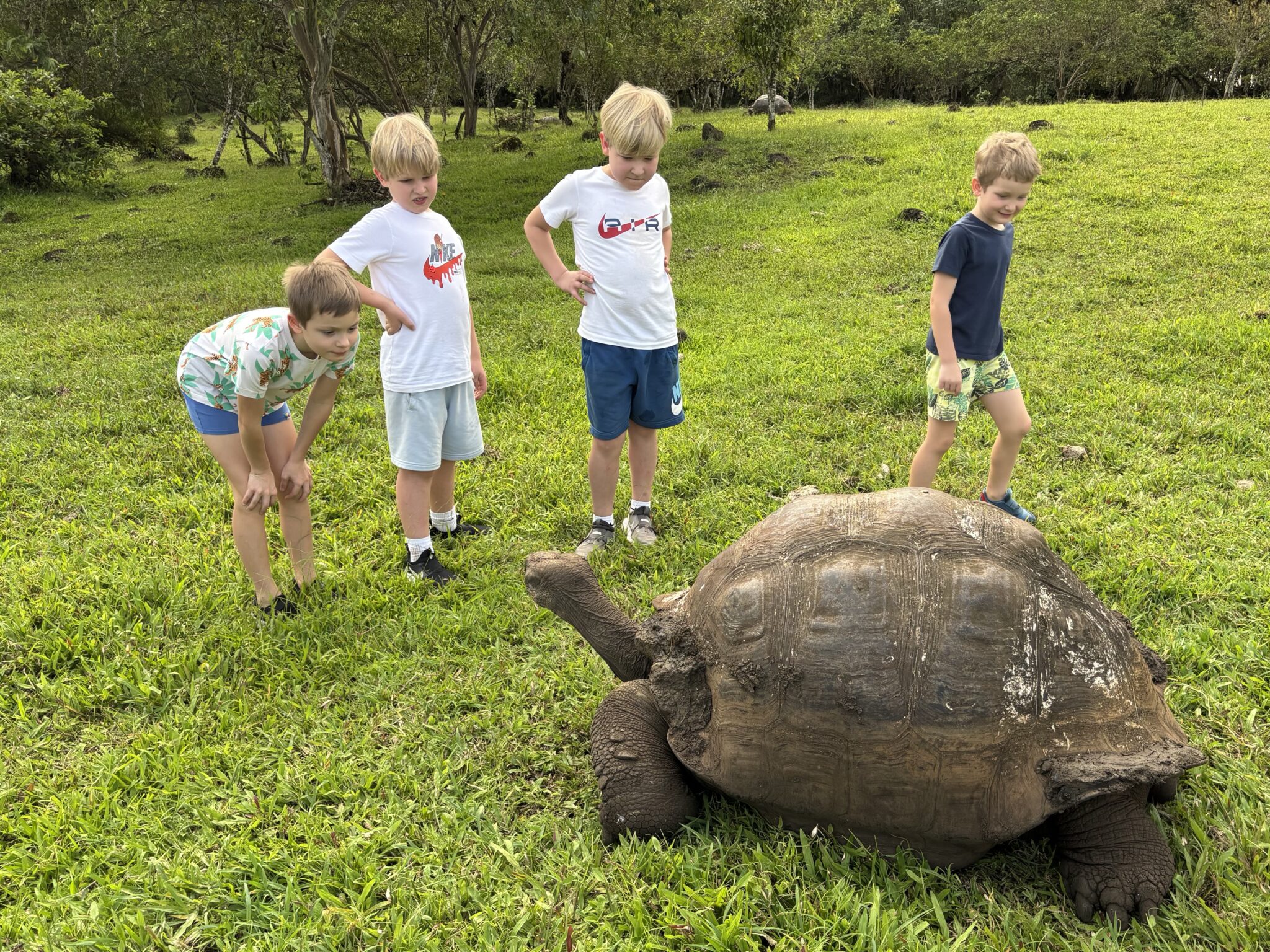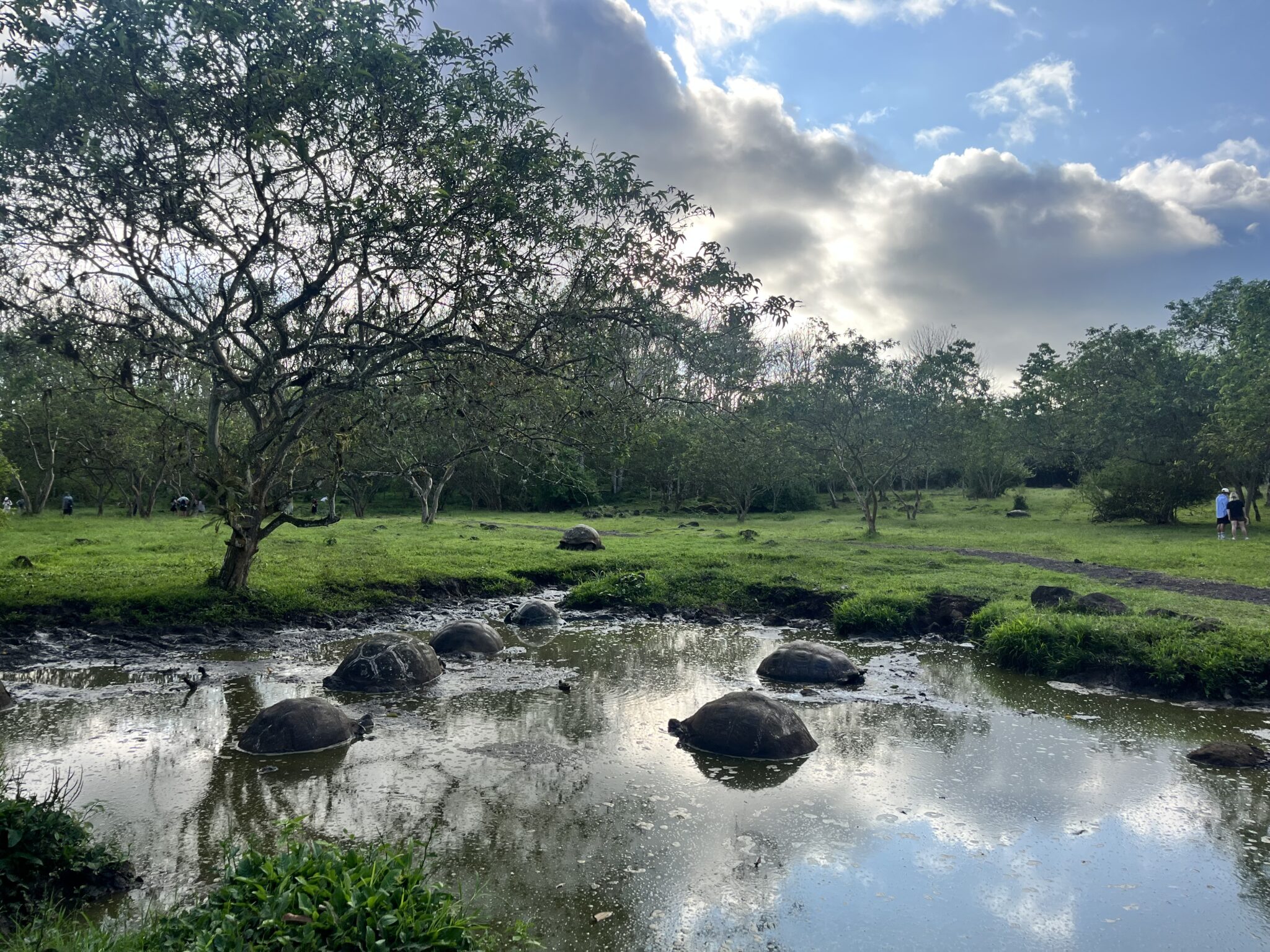 Po drodze z lotniska zajeżdżamy na lunch do farmy żółwi. Mijamy kratery wygasłych wulkanów bogato obrośnięte endemiczną roślinnością. Droga do rancza wiedzie przez zielone pola, na których znajduje się niezliczona ilość tych żółwi. Na wyspach Galapagos mieszka ponad 50.000 żółwi różnych gatunków (ludzi jest 30 tysięcy), żyją one średnio ponad 150 lat, ich wiek można rozpoznać po ilości krążków na skorupie. Można się do nich zbliżyć, ale zasada jest taka, że absolutnie nie można dotykać zwierząt.