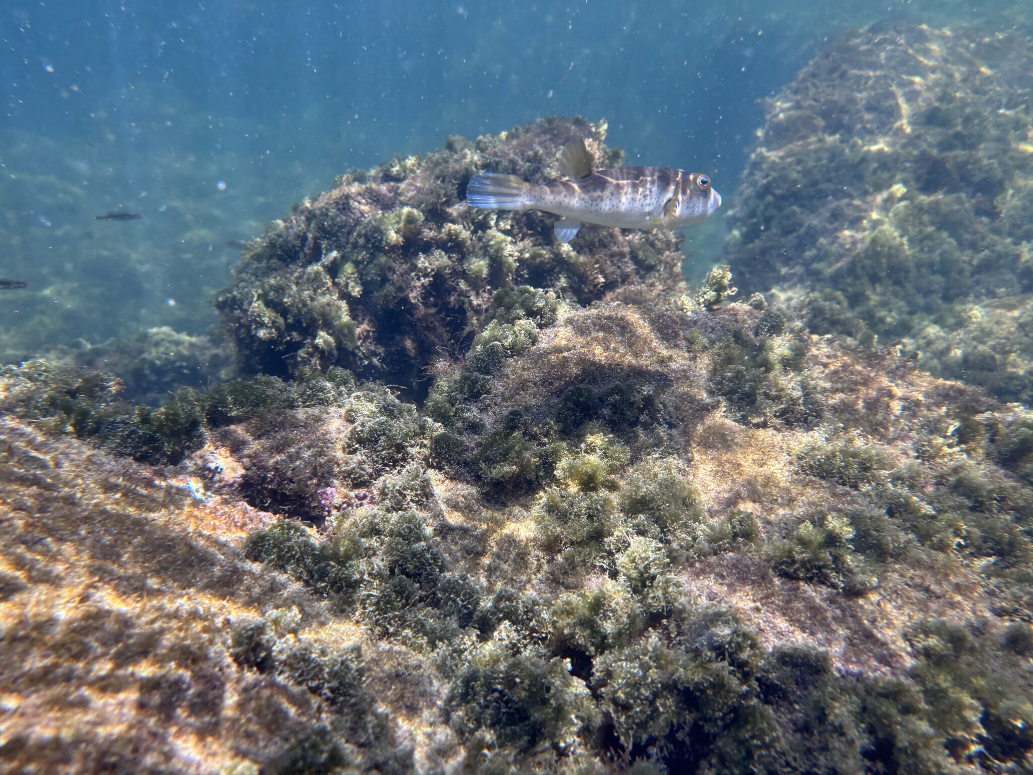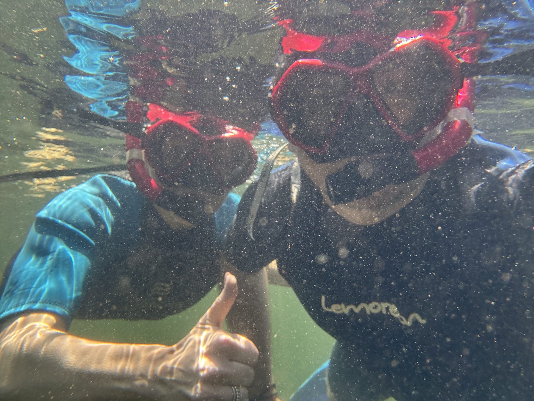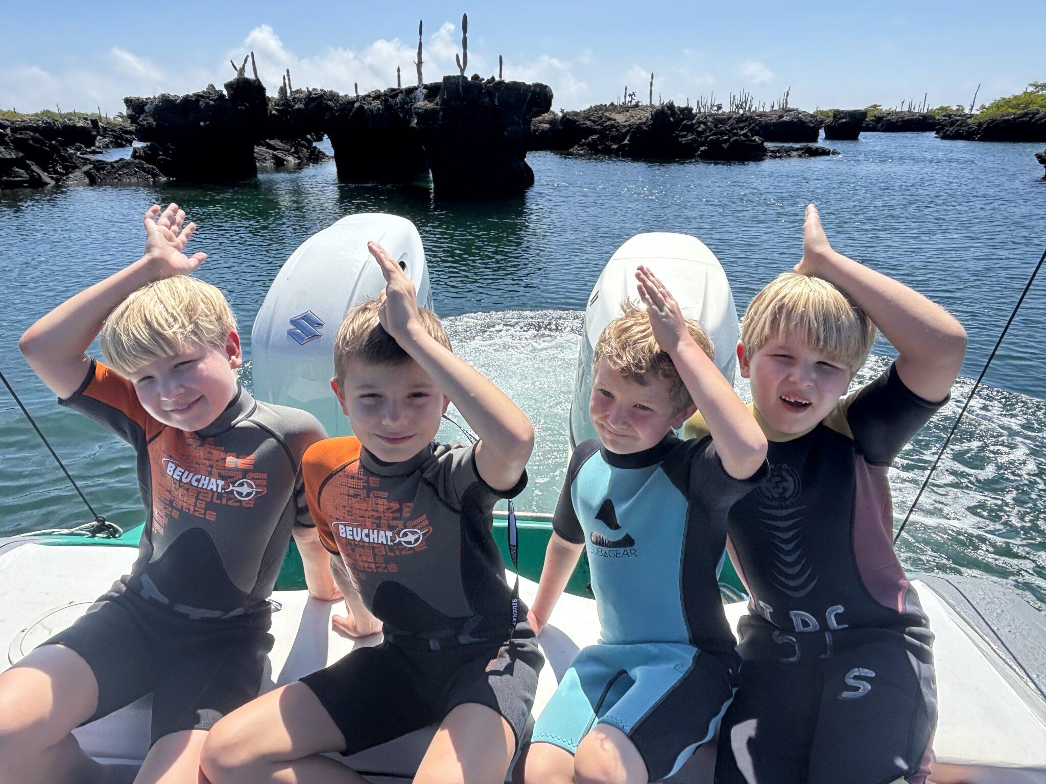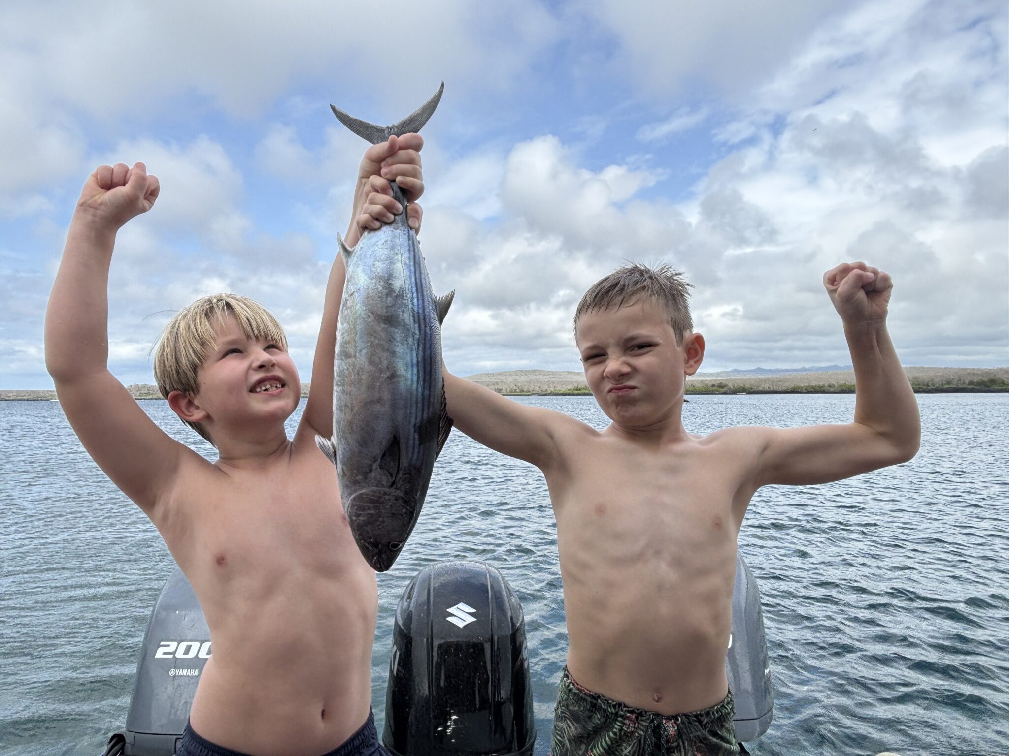 W ostatni dzień mamy całodniową wycieczkę na czwartą dla nas wyspę. Podczas podróży Olaf z Antosiem zarzucają wędkę i .. łowią tuńczyka. Niesamowite jak szybko, jak łatwo i jak wielki jest ten tuńczyk! Nurkujemy kilkukrotnie z maską, widzimy ogromne ławice ryb, ogromnego rekina 3m od nas, nurkujące żółwie i lwy morskie. To wszystko przy niesamowitej przejrzystości wody z widocznością na ponad 50m. Pyszny lunch na łodzi, Gucio po raz kolejny wykazuje się swoimi niesamowitymi zdolnościami nawiązywania kontaktów (co widzimy na każdym wyjeździe), bo przez ponad 1h toczy na łódce ożywioną rozmowę z 40letnim Niemcem, gdzie jak zwykle… sam go zaczepił.