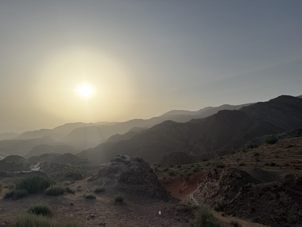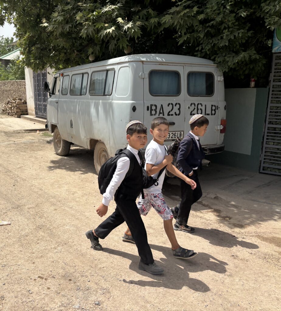 Po drodze oglądamy 1000- letnie mauzoleum, w którym pochowani są nauczyciele Islamu. Niestety nasz przewodnik jest bardzo ubogi w słowach więc niewiele udaje nam się dowiedzieć na temat tego przybytku. Po tych kilku dniach już wiemy że jest bardziej naszym opiekunem niż przewodnikiem.. Ruszamy w dalszą podróż. Droga jest wyboista, prowadzi głównie przez tereny pustynne, trochę górzyste, mało zamieszkałe. Nasz kierowca jedzie jak szalony, momentami jeży nam się włos na głowie. Jesteśmy jednak zmęczeni po spędzeniu 2 nocy, najpierw w jurcie i potem w pociągu -> kimamy po drodze. Tomek śledzi mapę, w pewnym momencie jesteśmy zaledwie 2 km od graniczy z Afganistanem!