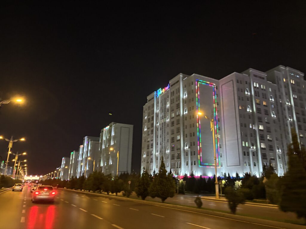 W czwartek po wczesnym śniadaniu zbieramy się, wracamy 2.5h do Kerki i stamtąd lokalnymi liniami lecimy do Ashgabadu. Wieczorem robimy sobie jeszcze tour po oświetlonym “Białym Mieście” (prąd jest za darmo, więc każdy budynek ma jakieś iluminacje). To miasto nie przestaje nas fascynować!